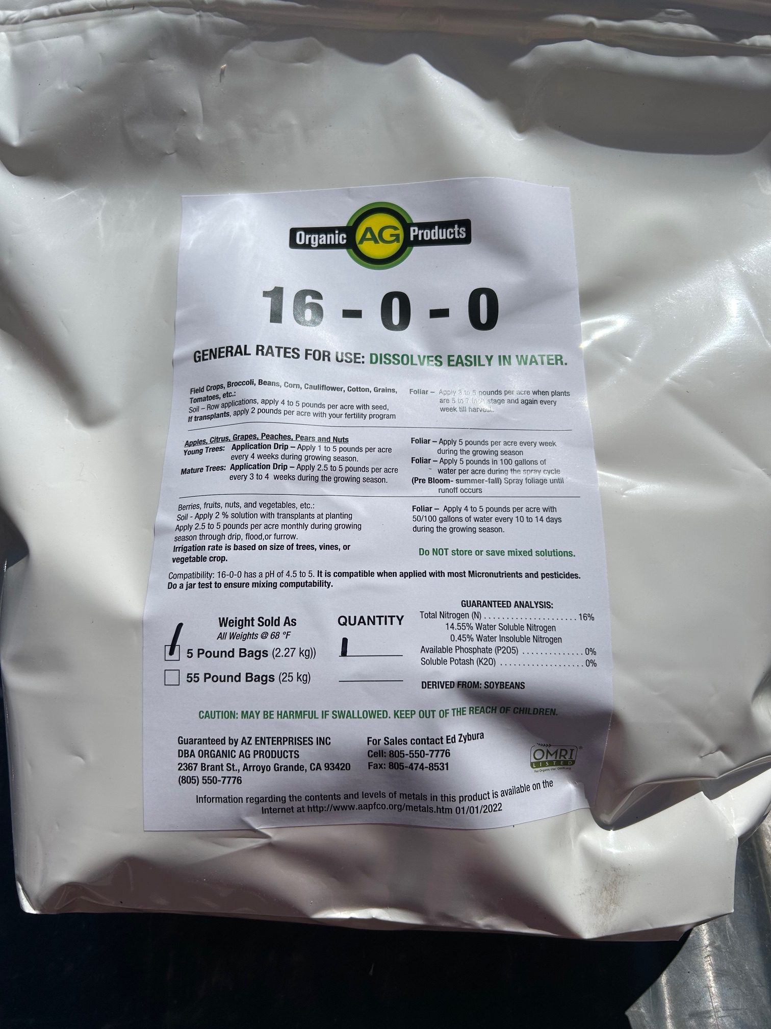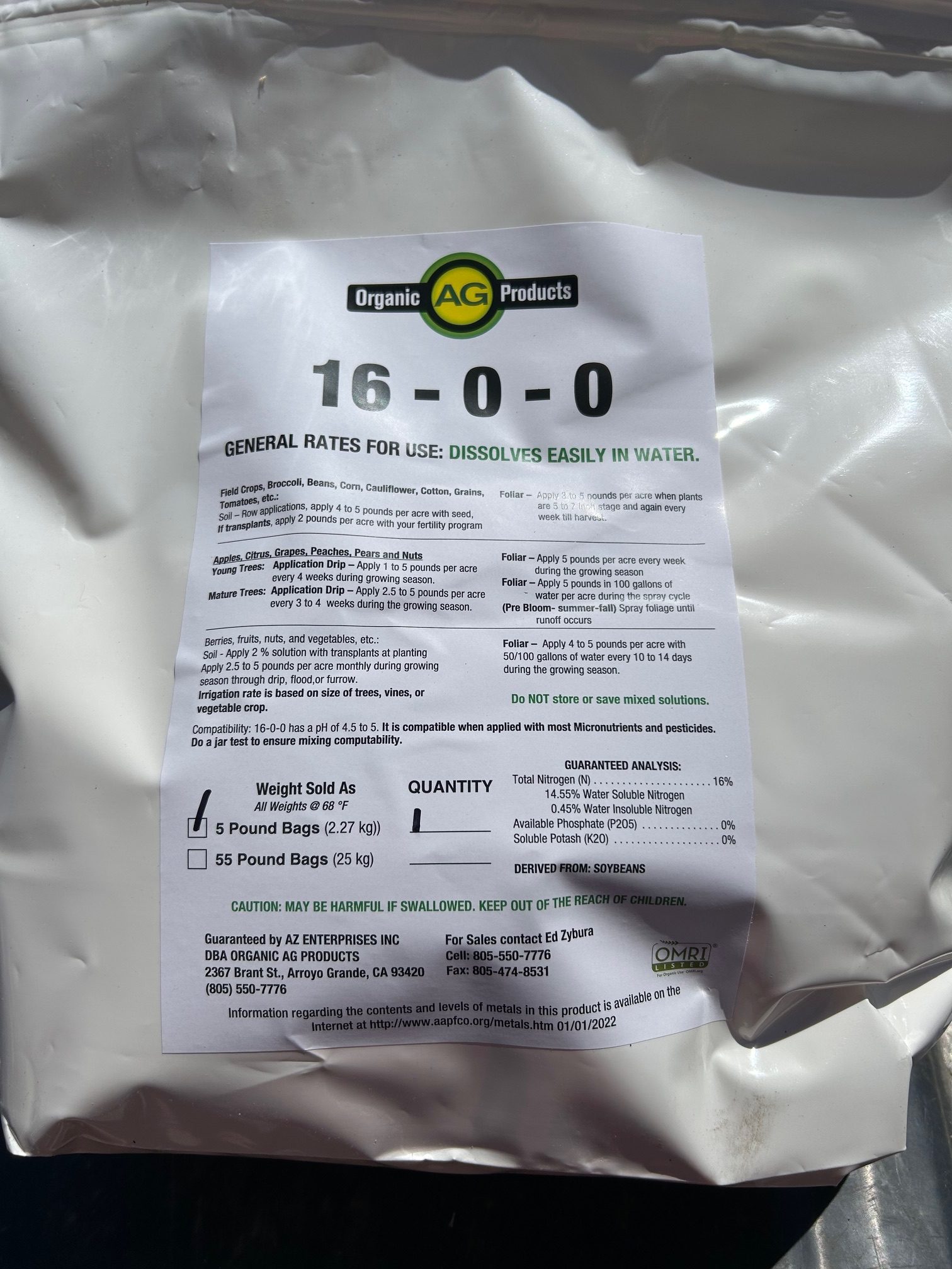 Boost leafy growth and nitrogen levels with Organic AG Products 16-0-0 fertilizer, made from soybean-derived nitrogen. This fully water-soluble, OMRI-listed formula contains 16% total nitrogen (14.55% from urea + 0.45% water-insoluble nitrogen), ideal for vegetables, fruits, field crops, and trees. Suitable for drip, foliar, or soil application, it dissolves easily and supports vigorous green growth throughout the season. Compatible with most micronutrients and safe for organic systems.